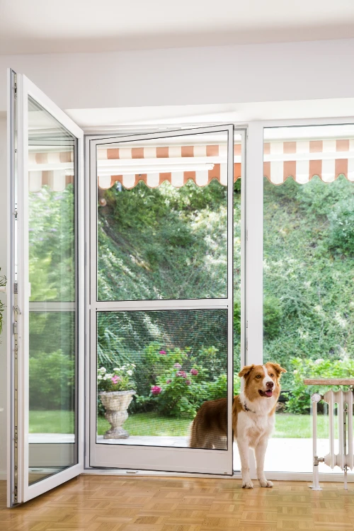 Besonderheit bei Türen: Aus Erfahrung können Hunde Pendel- und Drehtüren selbstständig öffnen – sie lernen schnell, die Tür anzustoßen. Mit Petscreen-Gewebe ist das kein Problem, da das Material den Belastungen standhält.